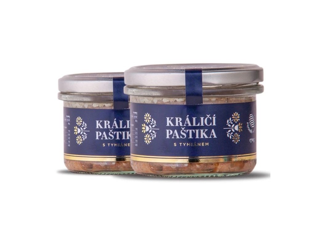 Složení: králičí maso min. 56 %, králičí játra min. 16 %, vepřové sádlo min. 12 %, bílé víno (obsahuje SIŘIČITANY), jedlá sůl, česnek, tymián min. 0,2 %, černý pepř.