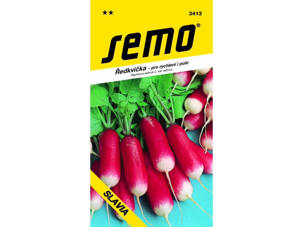 SLAVIA - červenobílá, podlouhlá bulvička do tří čtvrtin červená, spodní část je bílá typu Parisian Breakfast . Velmi raná odrůda vhodná k výsevu již od konce února k rychlení. Do volné půdy se vysévá v březnu a dubnu. Sklízí se od března do května. Je vhodná i pro pozdní pěstování. Vegetační doba od výsevu do sklizně je 32 – 35 dní, doporučený pěstební spon na rychlení je 15 x 3 cm.